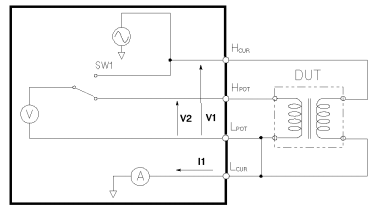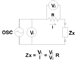 Mesure d'une impédance = V/I. On injecte un courant alternatif et on mesure la tension et le déphasage, ou réciproquement. |