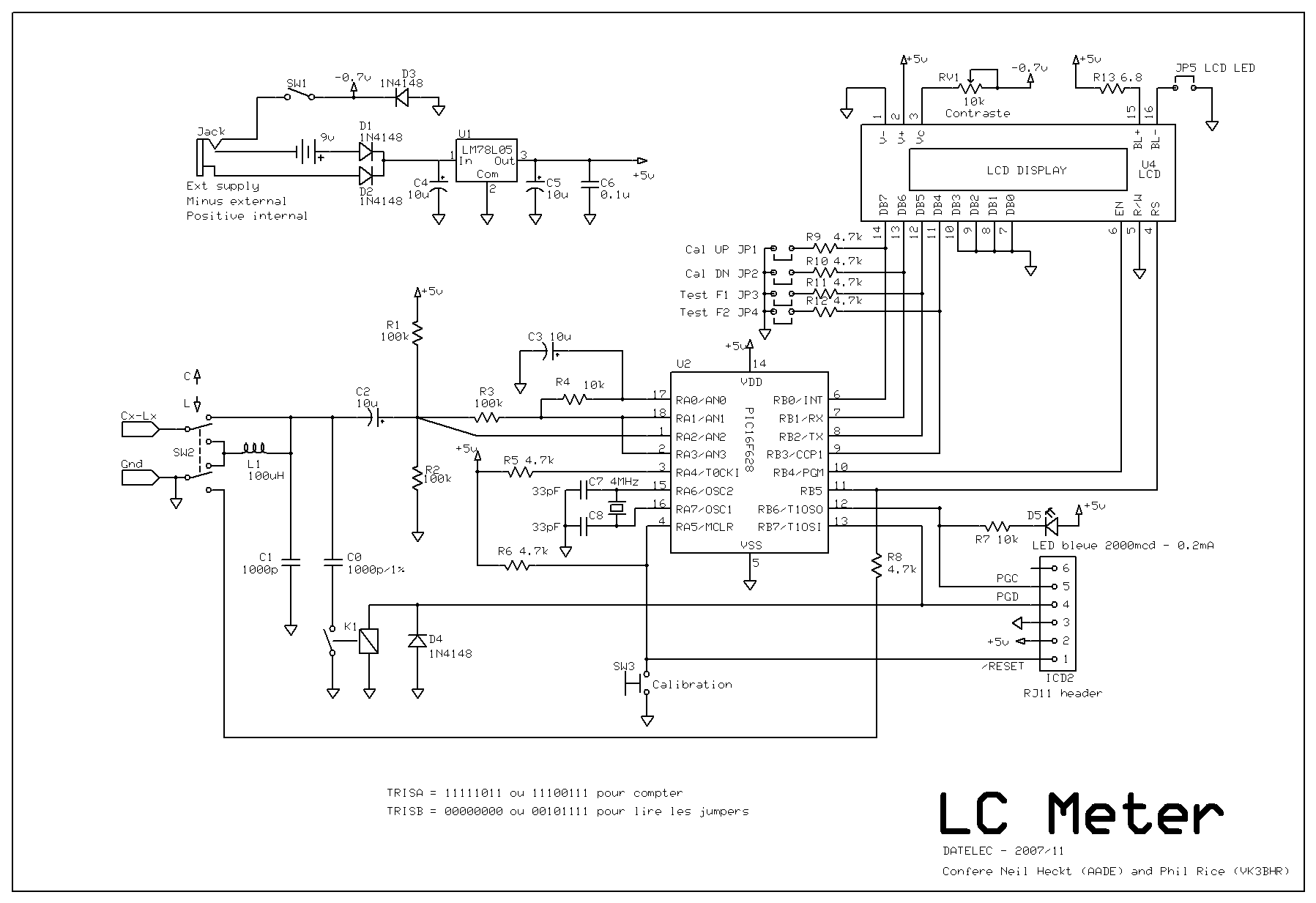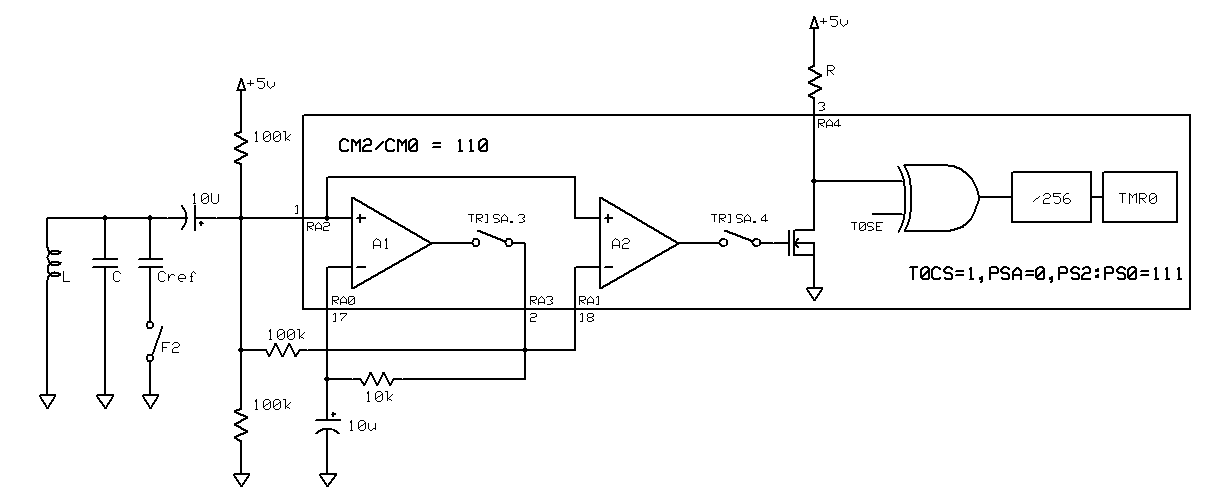 Après avoir lu l'article d'Elektor de juin 2007, et fait une recherche rapide sur le web, je suis parti d'un excellent circuit utilisant un PIC comme fréquencemètre, et ses propres amplis op internes pour réaliser l'oscillateur LC. Ce circuit est une évolution d'un schéma de Neil Heckt (AADE). L'interet de ce montage est qu'il est compact et relativement précis car il se calibre seul à condition qu'on ait une capacité étalon (1% ou 0.5%...)