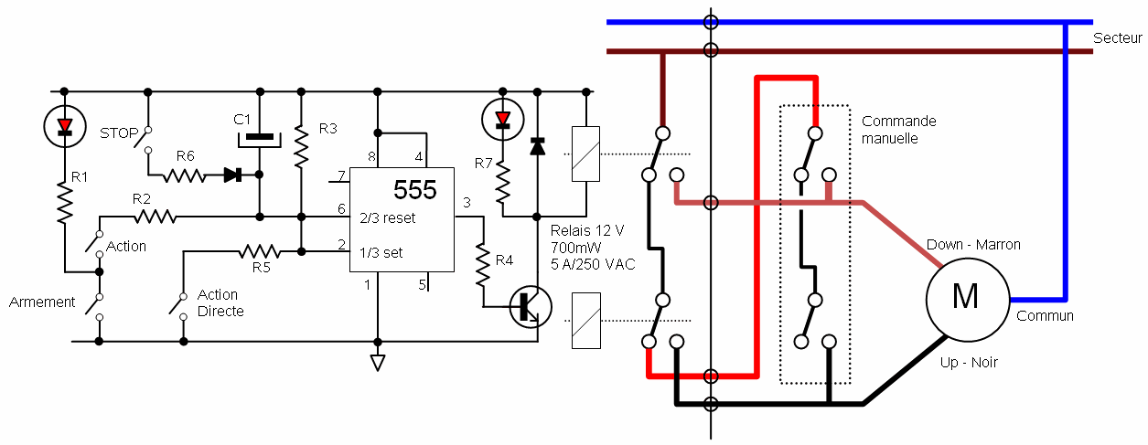 Si on ré-appuie sur le bouton d'action avant la fin de la temporisation, on remet à zéro le timer 555 et le relais passe au repos. Cela permet de stopper la manoeuvre en cas d'incident vu de loin.