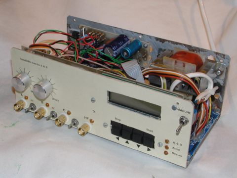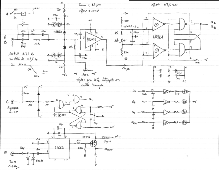 Un multiplexeur HC151 en entrée sélectionne les signaux à mesurer. Dans l'ordre : C, B, A, A>B, HF. Des canaux libres sont possibles et la fréquence d'horloge Fq est cablée sur la dernière entrée pour un autotest. Ce multiplexeur délibre gratuitement le signal et son complément.