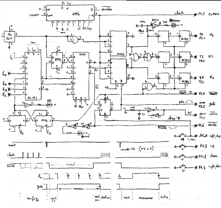 Le troisième multiplexeur HC153 est le multiplexeur de mesure qui va aiguiller Fq, Fx ou une clock du microcontrolleur vers les 3 compteurs Nq, Nx et N3, chacun réalisés par 1 compteur 8 bits HC393.