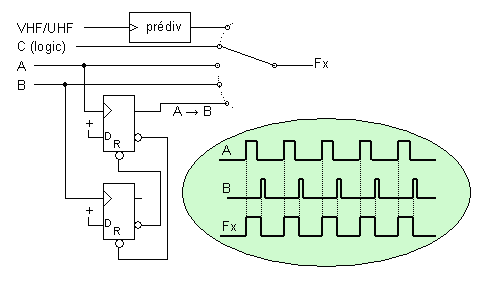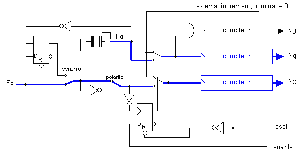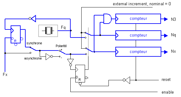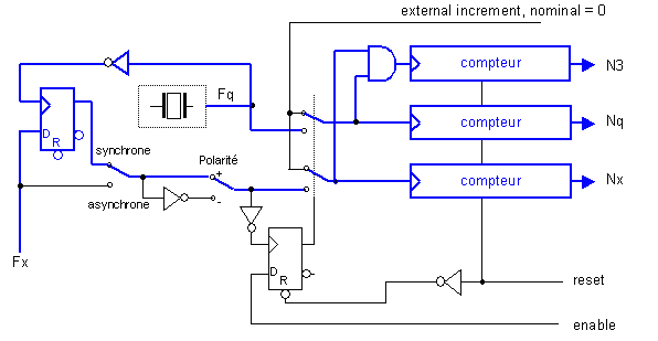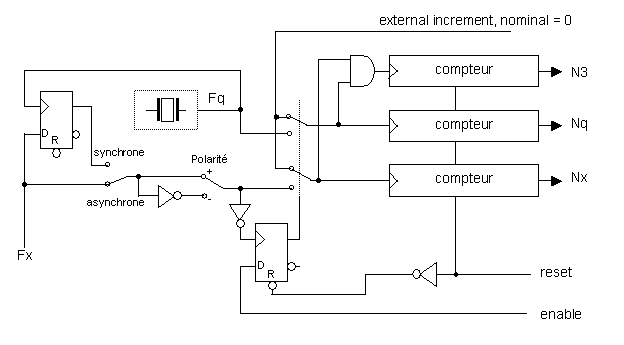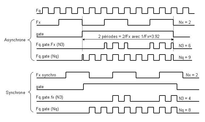 Chaque signal Fq et Fx (ou Fx/prediv) alimente un compteur après avoir été autorisé par une porte. On peut faire les mesures avec les deux signaux Fx et Fq non corrélés, ni rephasés, la mesure est appelée « asynchrone ».