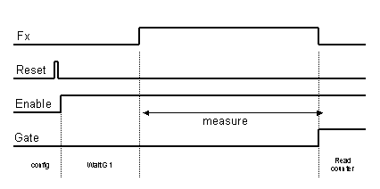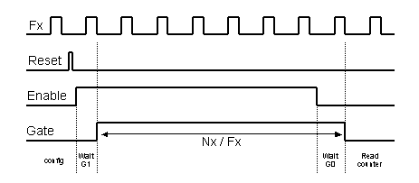 - le compteur Nx contient Tgate * Fx, nombre entier de périodes Fx . Si Nx déborde, la durée de porte est trop gande.