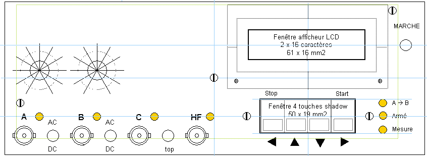3 leds signalent l'activité : une pour le signal AtoB, une pour signaler que l'armement est actif, la dernière pour indique une mesure en cours (présence de Fq sur l'entrée du compteur Nq).