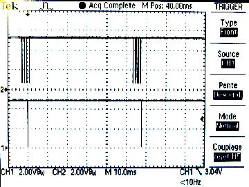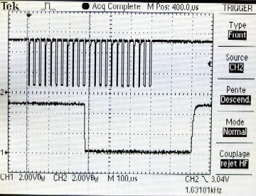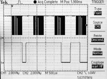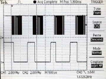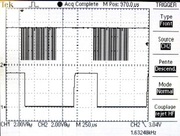 On convient de générer avec le micro controlleur, une salve IR, composée de 20 à 24 périodes F0, F0 étant la fréquence centrale du récepteur (probablement 36 kHz). Le rapport cyclique étant de 25% au sein de la salve. Chaque salve est suivie de la même durée de pause.On obtient ainsi un motif de 600 µs de signal à F0, suivis de 600 µs de pause, très proche du signal test. Dans ces conditions, le signal de sortie détecteur est évidemment fortement dépendant de la quantité de lumière reçue en retour, c'est à dire de la qualité et de la distance de la reflexion.
