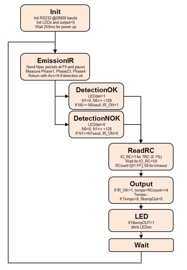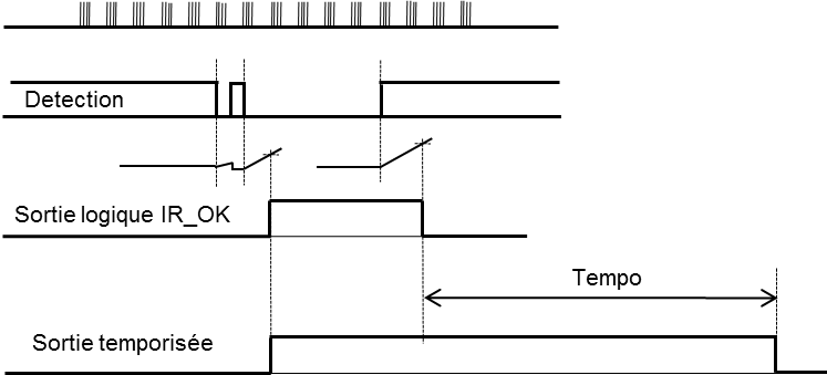 Pour sécuriser la détection, on applique ensuite un filtre temporel, qui consiste à activer l'état logique « IR_OK » si le signal détection est actif pendant un certain nombre de cycles, de même pour la désactivation.