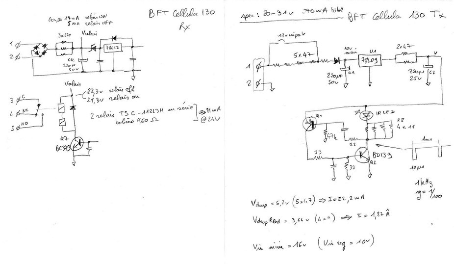 Pour le récepteur, le régulateur est un 78L12 et il faut commencer par le changer par un 78L09. Puis on court circuite la zener en amont du régulateur, puis les résistances de 220Ohms, puis on enleve le pont de diode integré et on en remet une simple sur la ligne +V, et enfin, on déssoude un des 2 relais et on met des cavaliers en place de sa bobine et de son contact travail.