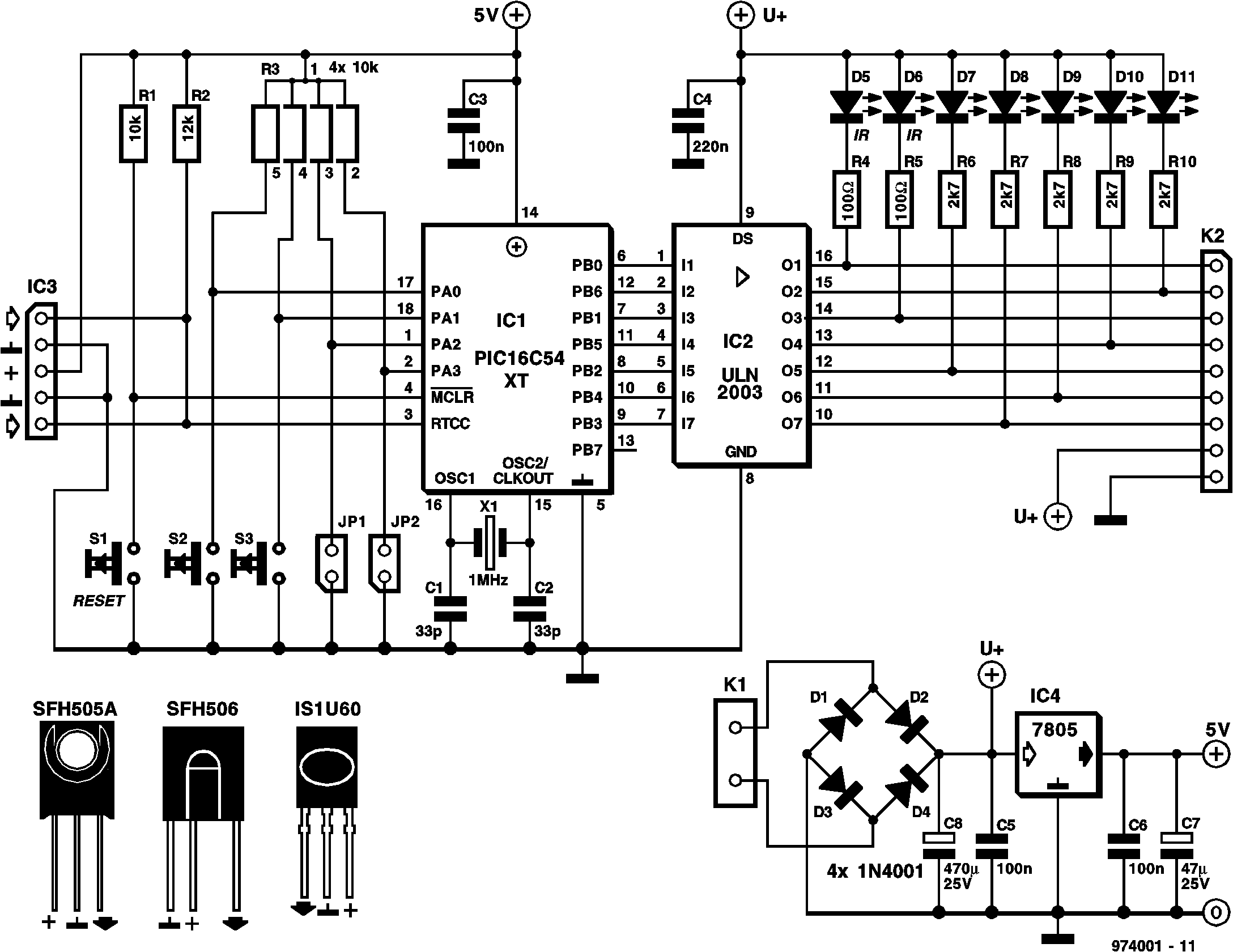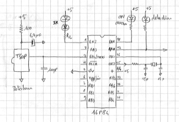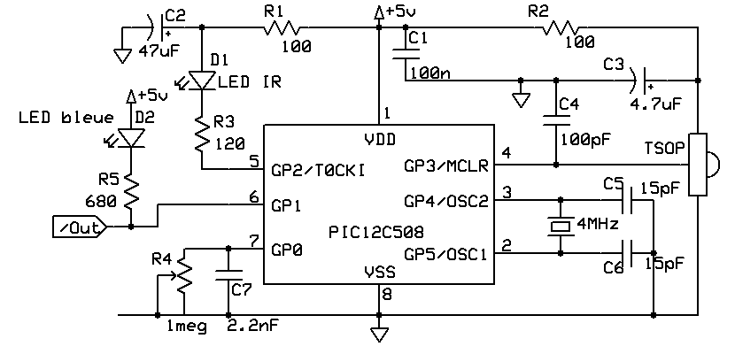 Le schéma est simple et direct. Il a été conçu pour un PIC16C84/F84/F84A, mais dans le but d'être à terme compatible d'un portage sur PIC12C508/C509. Les LED sont directement alimentées par le PIC en profitant de l'excellente capacité en courant des sorties au niveau bas. Dans cet état, chaque sortie présente une résistance équivalente de l'ordre de 33 Ohms, jusqu'à des courants de l'ordre de 50 mA.