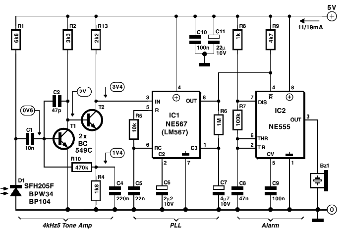 Nous voilà revenu aux temps héroiques des premières télécommandes IR où on réalisait des récepteurs avec des TCA440 ou TDA4050B (voir http://www.selfcontrol.cz/ele/infra.html). Ces circuits obsolètes s'alimentent sous 9-16V et consomment beaucoup. On peut aussi utiliser des PLL (voir Elektor 265), le LM567 offre une très bonne sensibilité, on peut aussi tout faire en discret (Cf BFT Cellula 130).