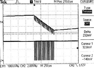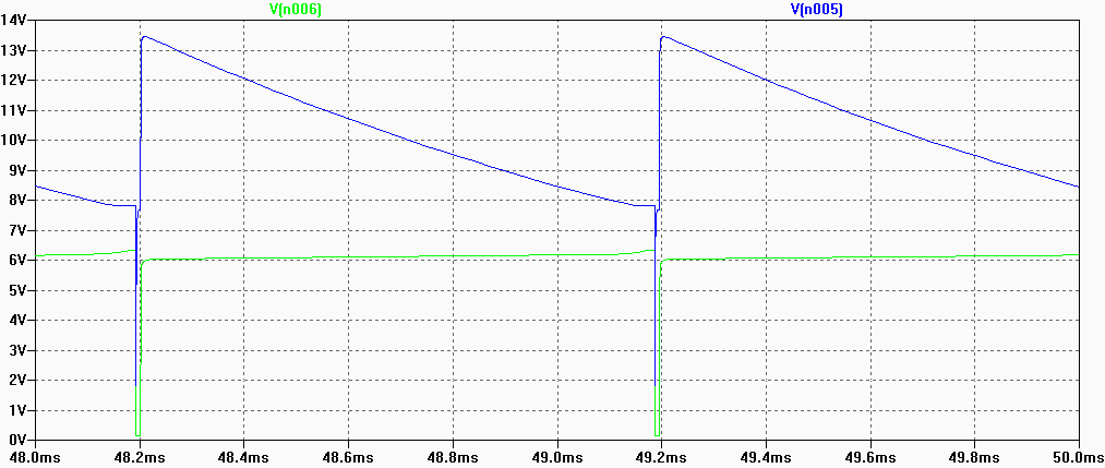 La capacité doit se recharger pendant la durée de pause, si on prend un cycle à 50-70ms, il faudra un courant de 0.43mA moyen pour revenir à la tension nominale, une résistance de 330Ohms donne des résultats satisfaisants. |