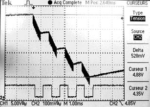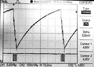 La durée de 4 salves en série, représente une durée totale de 5,2ms, et une durée d'illumination de 432µs. Avec un courant moyen de 130mA à peu près constant, la quantité d'électricité Q=I*t est de 56µC. Cette quantité d'électricité sortie d'une capacité d'une capacité de 100µF provoque une chute de tension est inférieure à 0.56V (dV=Q/C). On mesure au scope dV = 528mV c'est cohérent. |