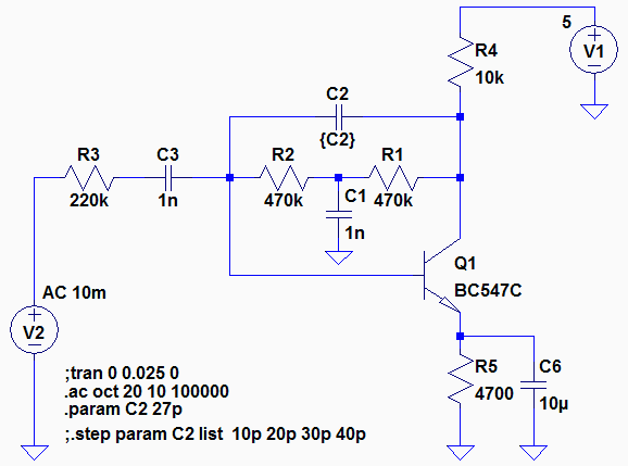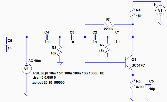 La première idée est celle d'un filtre passe bande, avec une structure simple dite en contre réaction simple, réalisable avec un seul transistor et avec laquelle on peut atteindre des facteurs Q moyens (tout est relatif).