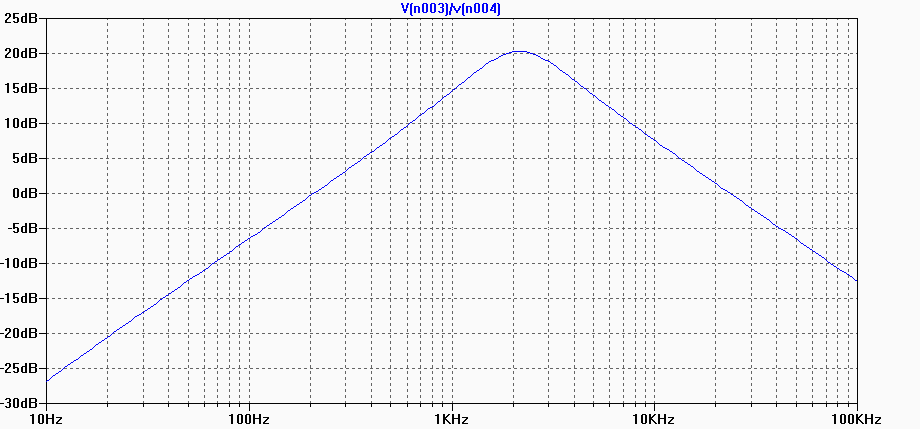 Les valeurs sur le schéma ci dessus donnent F0=2000, Q=3, A>10, mais l'attenuation relative du 100Hz n'est que de 30dB.