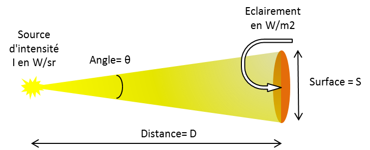 Si une LED produit une intensité lumineuse I (par exemple 16mW/sr), sous un angle θ (par exemple 50°), l'éclairement correspondant à la distance D vaut E=2I/D²(1 - cos(θ/2))/sin(θ/2))²