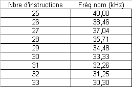 Avec un PIC tournant à 4MHz, la période d'émission est mutliple de 1 µs, et donc les fréquences obtenues sont discrètes par pas de 3%. Donc on aura une erreur systématique au maximum de 1.5%, en plus de l'erreur de la fréquence d'horloge du CPU (négligeable avec un quartz). Par exemple, on ne pourra pas obtenir 36.00 kHz mais ce sera 35.71 ou 37.04 kHz. |