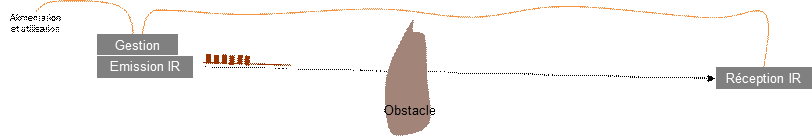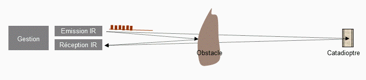 Le choix se porte rapidement sur de l'infra rouge modulé pour les raisons suivantes : filtrage facilement possible, chaine de réception plus facile à réaliser, très faible coût des modules et des diodes IR disponibles, et des modules de réception faible coût tout prêt. On pourrait imaginer utiliser des diodes lasers et des récepteurs collimatés, mais le prix, la fiabilité et la difficulté de réglage de ces dispositifs sont rédhibitoires.
