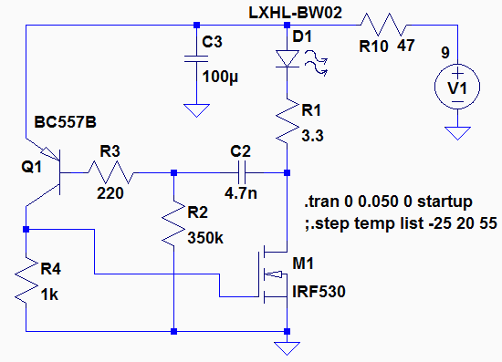 On peut aussi faire l'effort de concevoir une oscillateur à transistors, comme l'émetteur du BFT Cellula 130. Cet oscillateur est connu sous le nom de oscillateur complémentaire à relaxation. Initialement concu autour d'une paire NPN-PNP, on peut l'améliorer en utilisant un HexFET canal N en sortie pour avoir un courant LED IR plus stable en température.