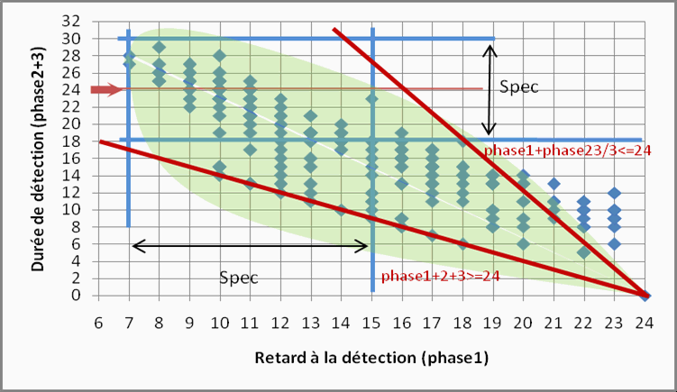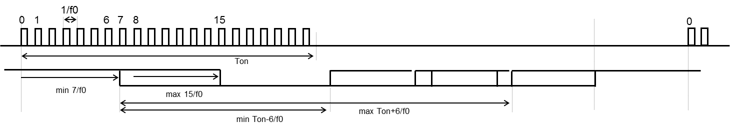 On constate que la durée de la détection n'est pas comprise entre 24 +/- 6/f0=18 à 30 comme le dit la spécification, mais s'étend de 6 à 29.
