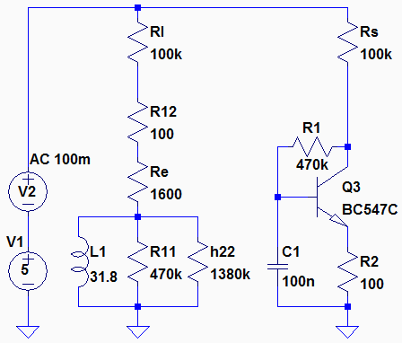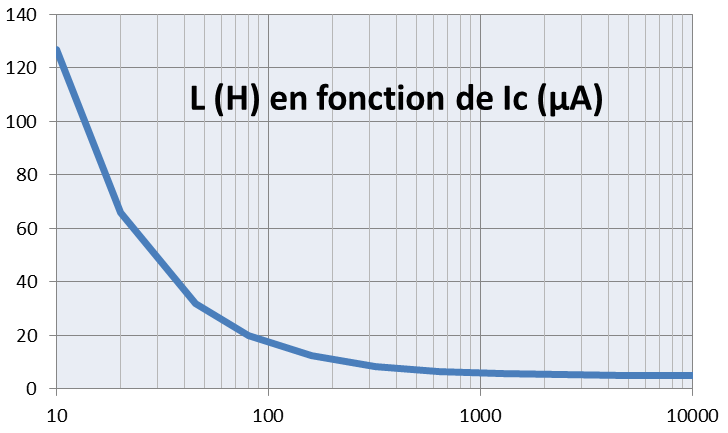 Par contre, l'inductance est fortement dépendante du courant Ic surtout lorsqu'il est faible. Une petite simulation le montre facilement. On voudrait controller l'inductance équivalente, il faudrait travailler avec un courant collecteur supérieur à 1mA, ce qui dans notre cas est impossible car cela va écraser le signal de la cellule.