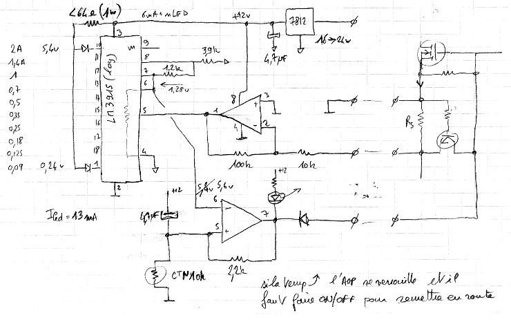 Un deuxième ampli op est utilisé pour surveiller la température du radiateur du régulateur de l'alim, et s'il déclenche, il se vérouille, il faut faire ON/OFF pour remettre en route, ce qui permet d'investiguer et réfléchir au défaut tout en étant en sécurité.