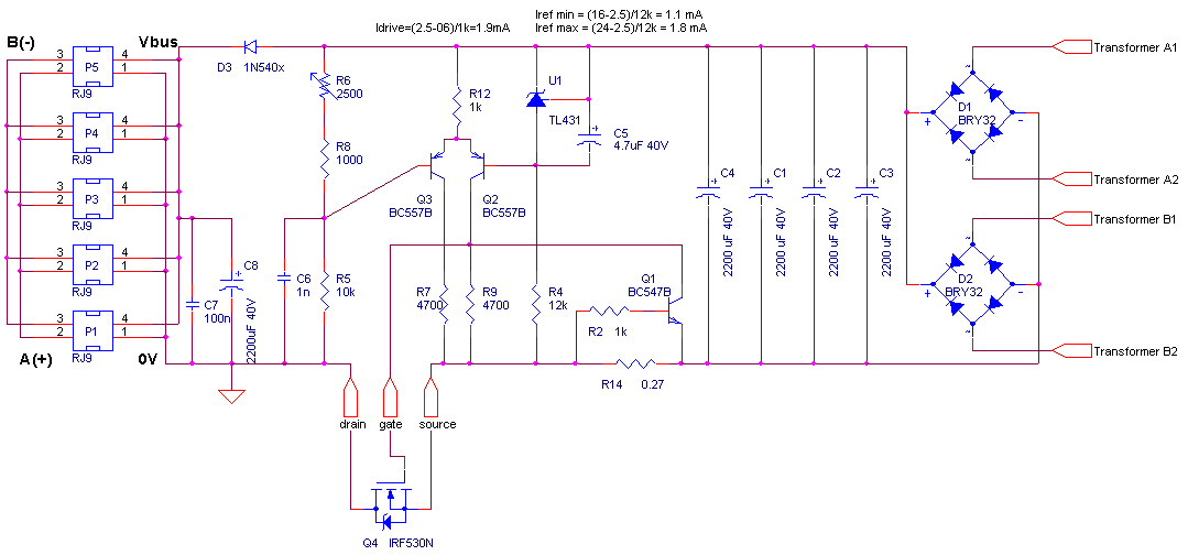 La référence de tension est confiée à l'excellent TL431, une limitation de courant est assurée autour de 2A, la résistance R14 doit dans ce cas être augmentée à 0.33 Ohms