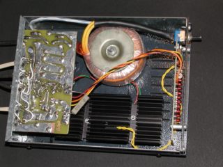La réalisation dans un boitier métalique, Le transistor MOSFET est monté sur un radiateur de récupération pour CPU Pentium 3, la thermistance est placée entre les ailettes. |