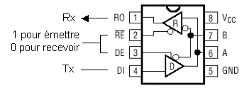 On peut relier ensemble /RE et DE ou bien de piloter que DE (prise de ligne) et laisser /RE à la masse pour recevoir toujours. Dans ce cas, le récepteur marche toujours, on peut mettre une LED pour montrer l'activité du réseau, et le micro-processeur gérera lui même la réception (bit REN du MCS51).