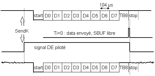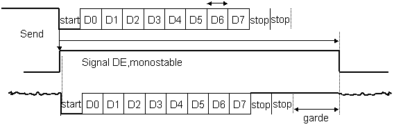 Il est plus universel de recréer cette information, en hard, sur la seule indication de la ligne Tx, avec un monostable. Dès que le bit start est envoyé, l'interface force à 1 le signal DE de l'émetteur RS485. Cà c'est facile, mais pendant combien de temps faut-il tenir la ligne ?