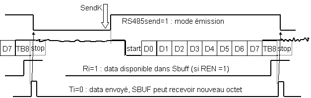 Dans le cas d’un µcontrôleur compatible MCS51, dans le mode 3 (9 bits série, baud rate variable), le bit RI monte au milieu du bit RB8, donc du premier bit stop reçu, et le bit TI monte à la fin de TB8, donc du premier bit stop envoyé. Donc en half duplex, RI monte un peu avant TI