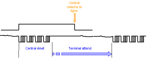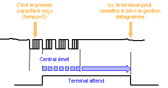 A la fin d'une transmission d'un octet par le central, le bus reste occupé par le central pendant une durée de garde (2.5 ms @9600 bauds). Chaque terminal doit donc attendre ce temps avant de commencer à transmettre. Comme la transmission d'un terminal commence obligatoirement à la fin d'un message émis par le central, il suffit d'attendre un peu soit :