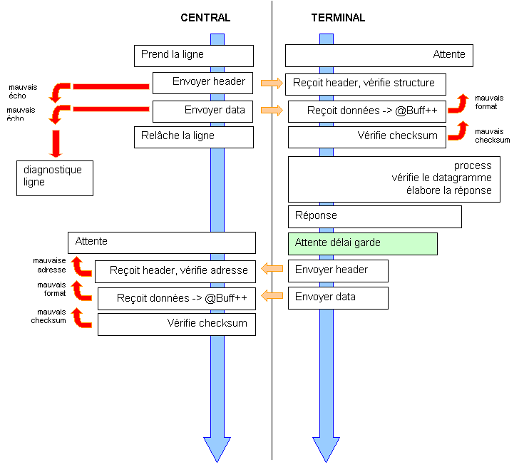 Il faut que chaque terminal puisse déterminer la position d'un octet dans un datagramme en réception. On utilise une temporisation. Si un caractère est reçu avec cette temporisation non déclenchée, c'est le premier caractère du datagramme, sinon on est à l'intérieur d'un datagramme. La temporisation est armée à chaque caractère reçu, hors écho. Le terminal doit remettre à zéro le datagramme reçu (et donc la temporisation), et être prêt pour en recevoir un autre : lorsque la temporisation se termine pour couvrir le cas d'un caractère parasite, la durée dans ce cas est donnée par le délai d'expédition du central. Comme on peut considérer que l'envoi sera toujours fait par un programme, et non à la main sur un clavier, cette durée est très faible, de l'ordre du temps de latence Windows, soit 5 à 20 ms. si une erreur est détectée en cours de réception du header, le terminal ne va rien émettre, le central va partir en time out. La durée est très faible là aussi. si une erreur est détectée sur le check sum, le terminal va émettre une réponse. Pas besoin de temporisation. dès que le terminal a terminé la gestion d'un datagramme. Cette dernière durée peut être très longue (l'exécution d'un datagramme (16 ms forfaitaire) +PLUS+ les N tentatives de réponses autorisées (3*135 octets *13/ baudmin) cela représente 1100 ms @4800 bauds), et donc être très pénalisant car le central devra attendre ce temps avant d'envoyer un nouveau datagramme, même si celui ci n'a pas de réponse, ou que la réponse précédente est sans erreur. Donc on considère que le terminal remet à zéro la temporisation dès qu'il entame sa réponse, il devient prêt pour un nouveau datagramme alors qu'il n'a pas terminé l'ancien, mais le central le sait. Le central ne devra émettre un nouveau datagramme que lorsque la gestion de l'ancien est terminée. Globalement, c'est le premier point qui est le plus dimensionnant, la durée de temporisation doit donc être supérieure à quelques ms (par exemple 17.77 = 64/3600ms). |