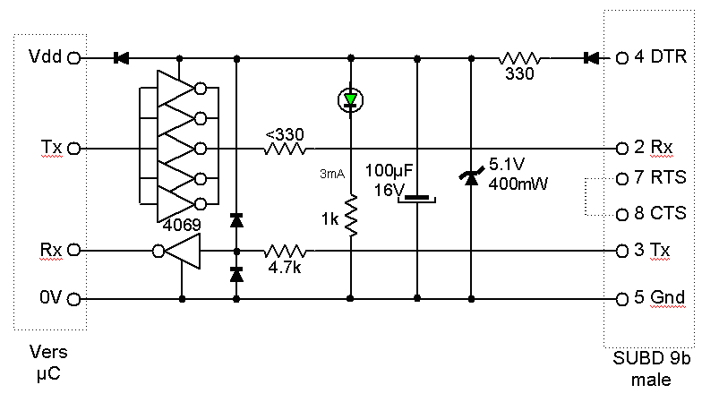 Le signal DTR est utilisé pour fabriquer une tension 5V locale avec une zener et un shunt de 330 Ohms. Cette valeur peut être réduite à 100 Ohms pour des interfaces à faible tension. La LED verte indique la présence de cette tension.