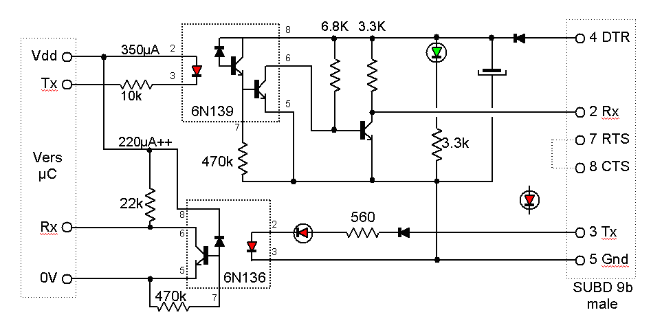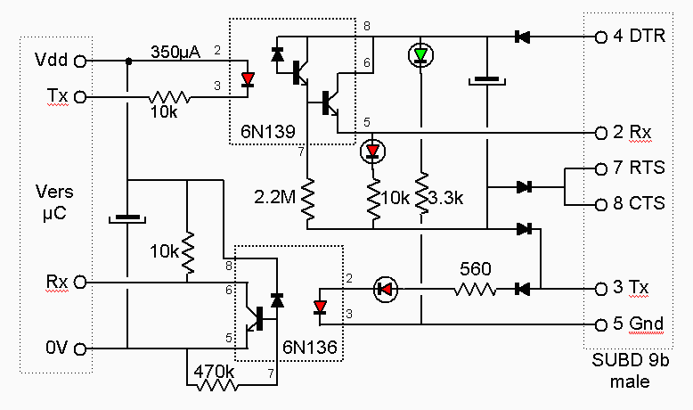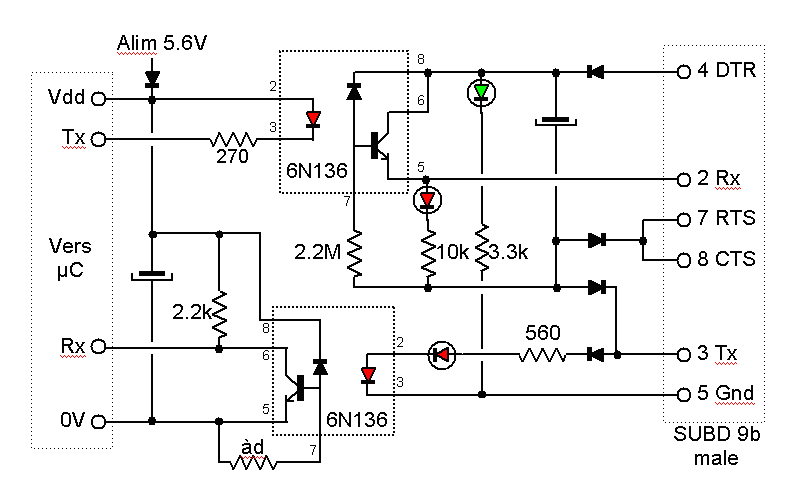 Les performances ne sont pas bonnes pour la ligne Rx, l'utilisation d'un opto en émetteur suiveur n'est pas optimale. Il vaut mieux l'utiliser en émetteur commun, mais dans ce cas, il faut commander la LED sur signal positif, en baissant le courant car et la capacité en sortie de courant des IO d'un circuit µcontrôleur est faible.