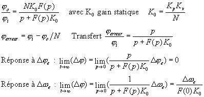 La fonction de transfert erreur/entrée, montre clairement l'effet intégrateur amené par le VCO, l'erreur de poursuite est donc nulle sur un échellon de phase quelque soit le type du filtre de phase.