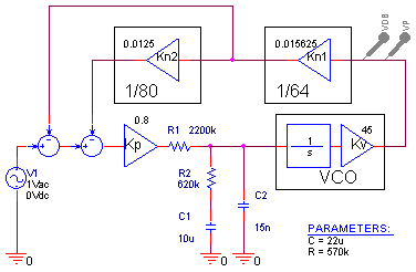 Le VCO a un tranfert où la fréquence du signal de sortie (dérivée de la phase) est proportionnelle à la tension d'entrée. La phase du signal de sortie du VCO est donc homogène à l'intégrale de cette tension. On dit ainsi qu'un VCO se comporte comme un intégrateur.