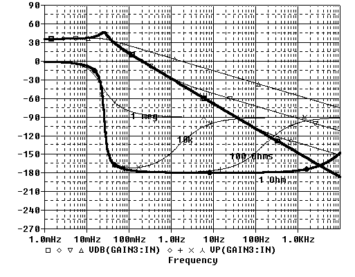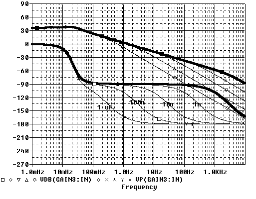 Avec C2=0, on tourne la simulation avec R2=1, 100, 10k, 1 meg. On voit apparaitre le zéro du filtre, et lorsque la résistance R2 devient suffisamment forte, la réponse en phase reste au dessus de 90°, la pente passe à 6dB/oct et le système revient au premier ordre. Noter que la marge de phase devient correcte (45°) à partir d'une valeur de l'ordre de 150k. |