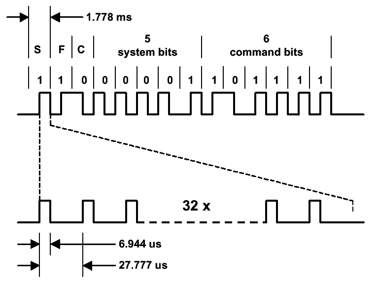 As shown in next figure, the bi-phase code words modulate a 36 kHz carrier, before being transmitted via the IR LED. Since the repetition period of the 36 kHz carrier is 27.778 us and the duty factor is 25 %, the carrier pulse duration is 6.944 us. Because the high part of each bit of the RC5 code word contains 32 carrier pulses, 1 bit period is 64 x 27.778 us = 1.778 ms.