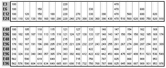 Les valeurs sont normalisées selon des séries. Le nombre de valeur par décade est évidemment fonction de la tolérance de fabrication. Si la tolérance est de +/- 5%, il y a 48 valeurs possibles par décade, la série est appelée "E48".