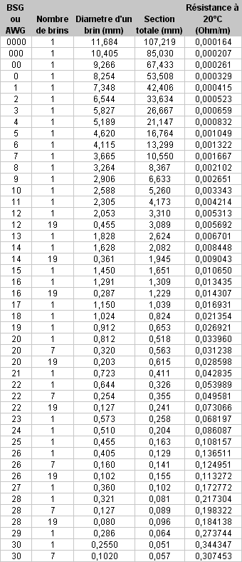 La section des cables électriques est historiquement codée selon un standard Américain, l'AWG (American Wire Gauge), c'est un nombre entier ; la formule magique qui lie l'AWG à la section en mm pour un cable monobrin est