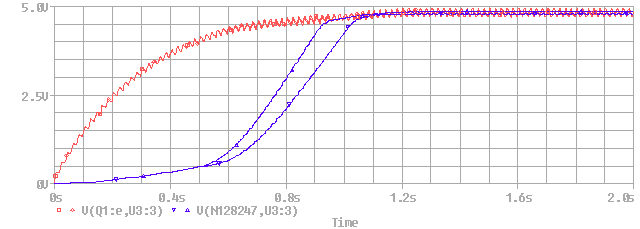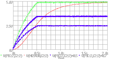 Les courbes ci dessous donnent la variation d'un signal reset RC, 40k et 10µF, avec une alimentation lente (alim secteur 100nF+100nF/100µF), et un circuit qui consomme 1mA (5k équivalent). Le signal retardé par le RC passe le seuil mini (Vih=0,5*Vdd mini) ou le seuil maxi (Vih=0,7*Vdd maxi) toujours lorsque la tension d'alimentation est supérieure à 3V.