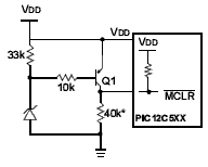 Un réseau RC est fortement conditionné par la valeur du pull-up interne sur la broche /MCLR et celle ci est très variable. On trouve parfois des valeurs à 250µA soit 20k min (PIC12C508 erreur très probable), ou bien 250-500k (12C508A), ou bien +/-30µA (12F508) ou encore +/-5µA (PIC16F628). Bon bien sûr, c'est une résistance fortement non linéaire, qui diminue fortement lorsque la tension à ces bornes diminue. Le courant de fuite de la broche /MCLR étant de l'ordre de +/-5µA, et le Vih de cette entrée est toujours inférieur à 0,8Vdd, Microchip ne recommande pas de dépasser 40k en pull up externe. Avec une capacité externe de 10µF, la constante de temps reste faible, et il n'est pas sûr qu'on arrive à retarder suffisamment le reset dans le cas d'alimentations très lentes, par exemple 1 ou 2 V/s. |