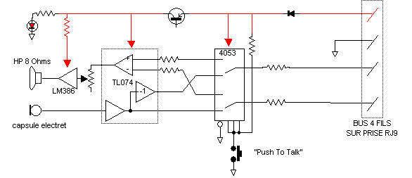 Chaque terminal est relié au bus audio avec 2 résistances, de l'ordre de 600 Ohms. Elles évitent des problèmes si 2 terminaux sont simultanéments en émission, et surtout elles isolent bien les signaux RS485 de l'entrée mux.