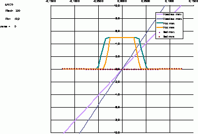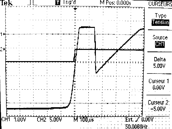 On voit sur cet oscillogramme le comportement du comparateur lors du passage du seuil montant, avec Q en entrée. Puis 130µs après, on met Q en sortie à Zéro. L'effet est immédiat sur la tension D qui chute.