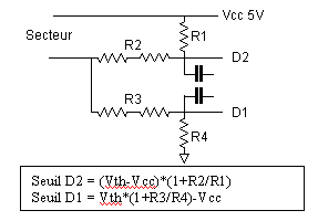 On utilise une détection simple, en envoyant le secteur au travers de 2 résistances de 330k, sur la broche RB0/INT. Une routine d'interruption lit le timer1 et retourne la valeur dans le corps du programme pour traitement ultérieur (on a 20ms pour le faire).