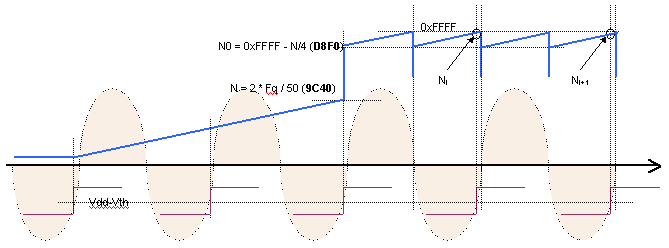 La valeur à recharger est pour une demi période est donc N0 = N/4 = 10000 (0x2710) +/- 40 (0x0028), elle doit être comprise entre 9500 (0x251C) et 10500 (0x2904).