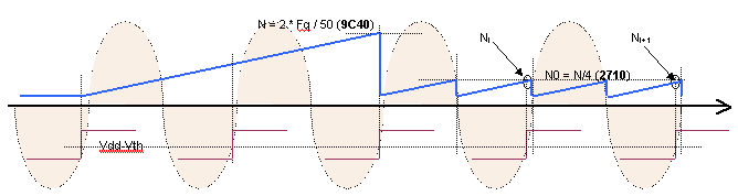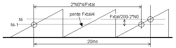 L'oscillateur numérique (NCO) piloté par le timer 1, se comporte comme un intégrateur par rapport à Fxtal. A chaque échantillonnage de sa phase, toutes les 20ms (à 50Hz), une valeur phi est lue.