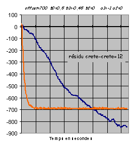 On constate que ce filtre offre un amortissement fort, la consigne est atteinte en 1 seconde, avec un résidu crête-crête de 12.