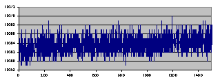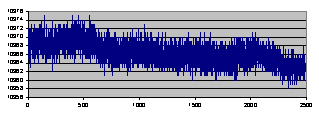 La figure ci dessous donne l'allure de N0, sur presque 2000 périodes (40 secondes), avec b0=0.5 et b1=-0.25 avec un calcul sur 8 bits. Les erreurs dues à l'arrondi sont grandes, le bruit crête à crête est de 6 à 10 unités.