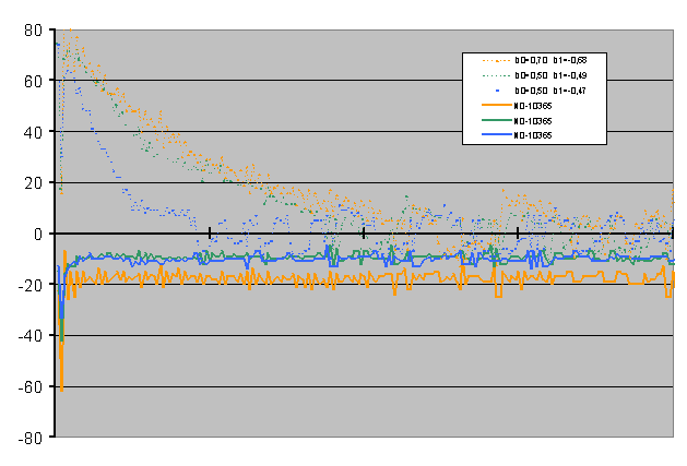 Une série d'essais a été réalisées avec différentes valeurs de b0,b1, avec un seuil de mise en route à +/-5 (l'algorithme tourne si |phi|>5).