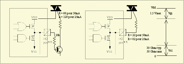 On peut aussi commander directement la porte à la sortie du microcontrolleur, et prendre en compte que le FETMOS canal N va se comporter comme une résistance comprise entre 30 et 50 Ohms. La résistance Rgate dépend du courant voulu. Si on souhaite garantir 50mA, on prendra 22 Ohms, si 25mA suffisent, on prendra 82 Ohms. Cette façon de faire est hors spécification, Philips par exemple considère que les sorties des ses µC ne peuvent pas sortir plus de 20mA, et propose d'en mettre plusieurs en parallèle. ST fait de même pour ses micro ST6.